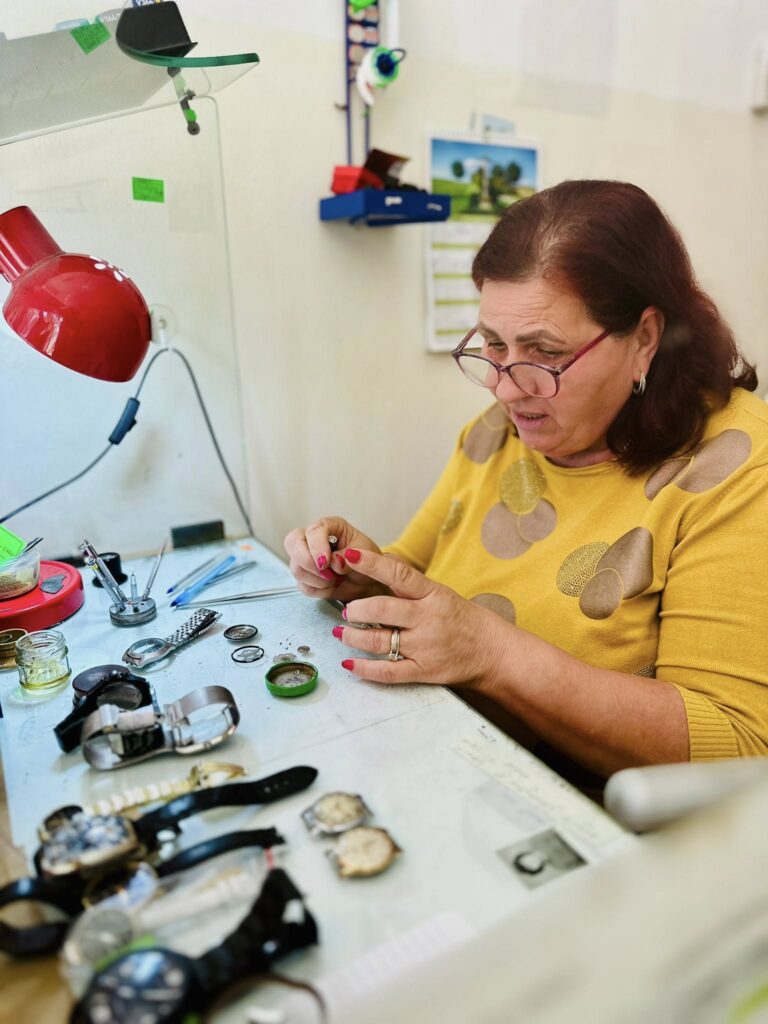 Am întâlnit-o zilele trecute pe Angela Gheorgheș, printre ultimii ceasornicari în activitate din Bacău. Pe strada Mihai Viteazu 1, într-un spațiu mic, funcționează atelierul său de reparații.